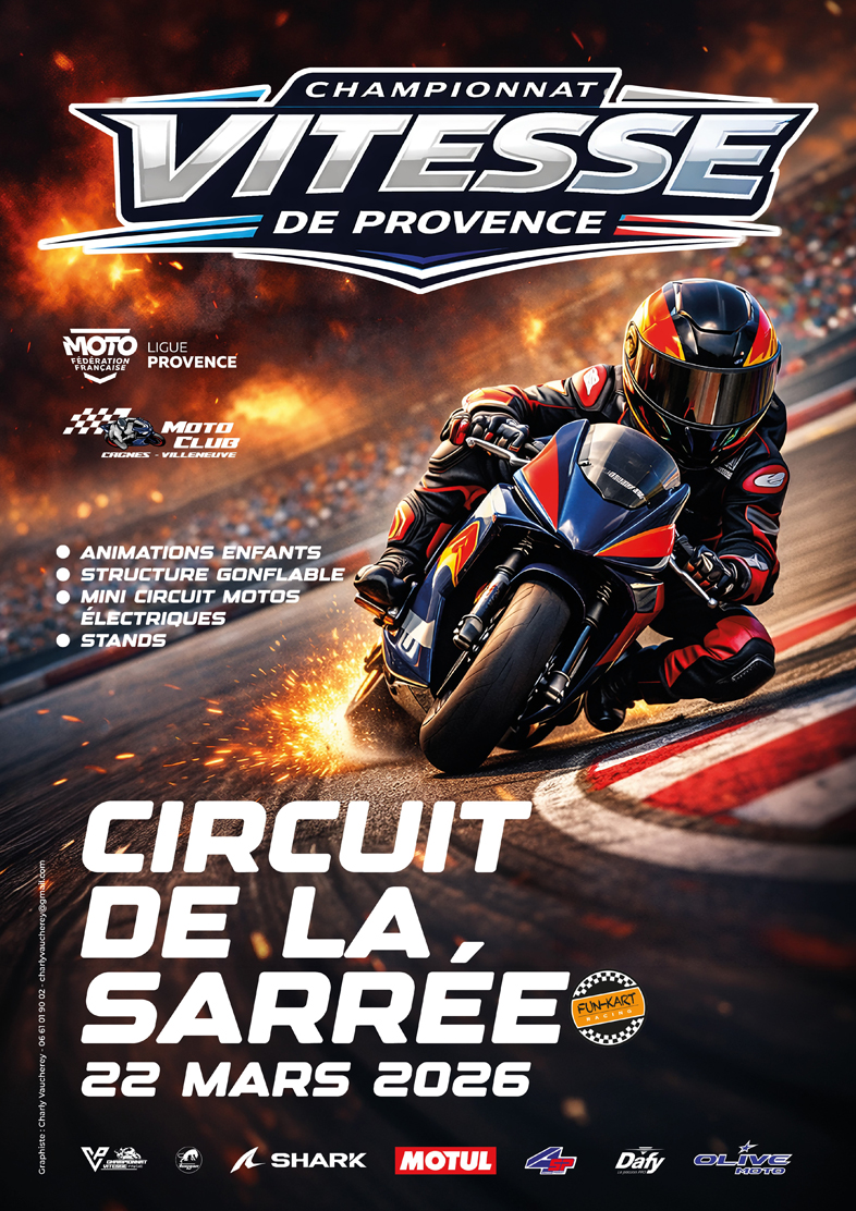 Karting La Sarrée Plateau de la Sarrée, route de Gourdon, LE BAR SUR LOUP, FranceDimanche 22 mars 2026, le circuit de la Sarrée va accueillir le Championnat de Vitesse de Provence. Organisation Ligue Motocycliste de Provence et Moto Club Cagnes Villeneuve Loubet Sur place : animation enfants, structure gonflable, mini-circuit motos électriques, stands, etc.