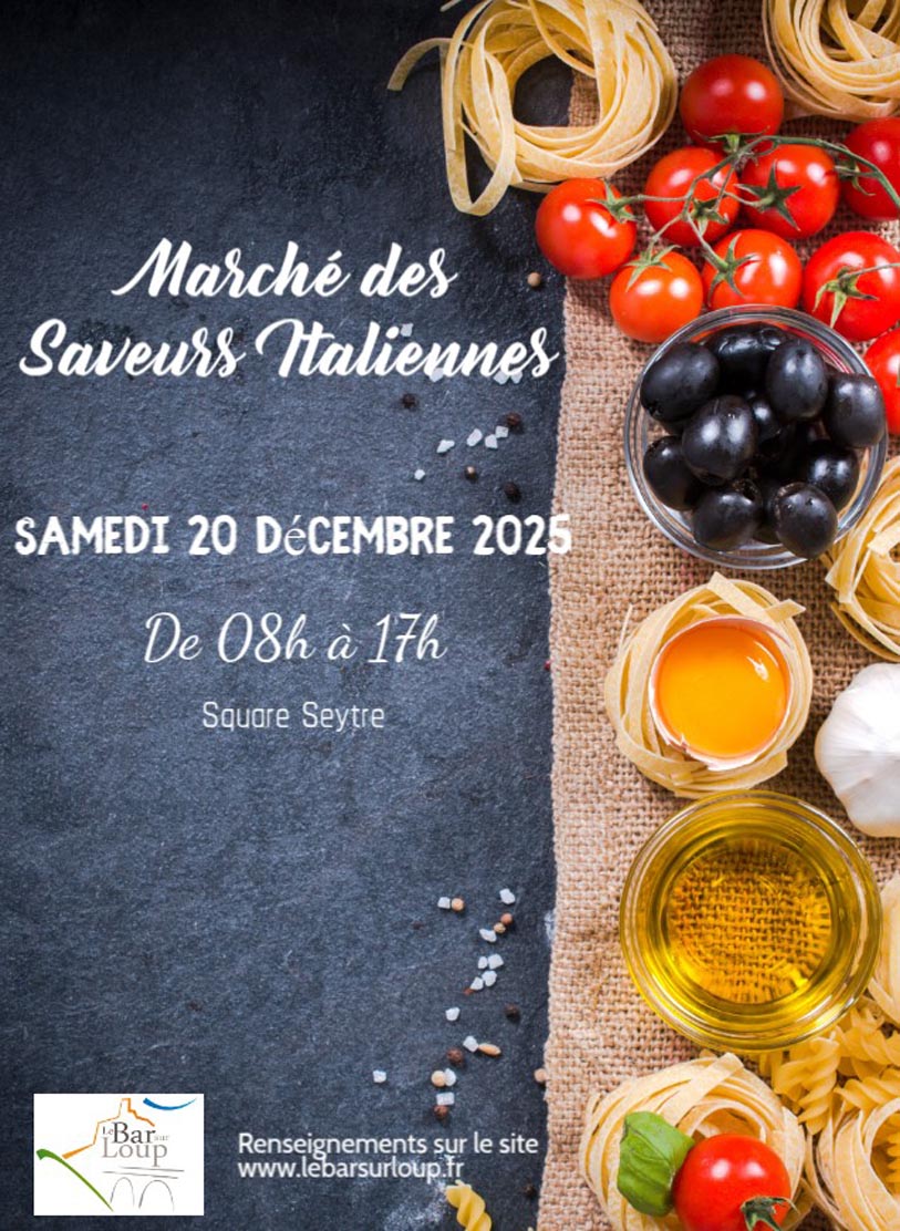 Samedi 20 décembre 2025, de 8h00 à 17h00 sur le square Seytre, marché des saveurs italiennes.