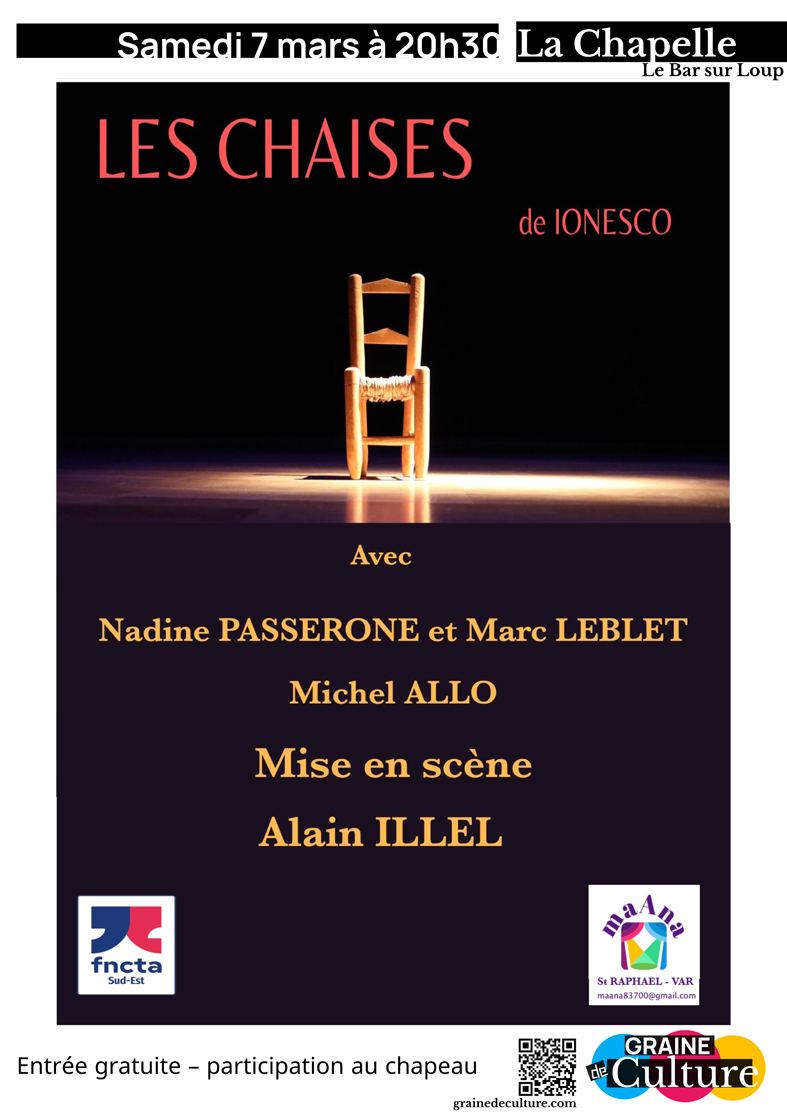 Soirée théâtre proposée par Graine de Culture, samedi 7 mars à 20h30, à la chapelle de la Passerelle : « Les Chaises » de Ionesco