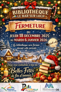 Voir l'image agrandie Fermeture de la Bibliothèque Municipale Par Jennifer VALSTAR|2025-12-18T17:54:46+01:0018 décembre 2025|Cadre de vie, Non classé| Partagez cette info sur vos réseaux sociaux ! FacebookXLinkedInPinterestEmail Articles similaires Démarchage abusif Galerie Démarchage abusif 11 décembre 2025 Fermeture de la Bibliothèque Municipale le 13 décembre 2025 Galerie Fermeture de la Bibliothèque Municipale le 13 décembre 2025 9 décembre 2025 Toutes les informations sur le stationnement et la circulation le jour du Marché de Noël Galerie Toutes les informations sur le stationnement et la circulation le jour du Marché de Noël 3 décembre 2025 Inauguration du square Charles Minetti, samedi 6 décembre 2025 Galerie Inauguration du square Charles Minetti, samedi 6 décembre 2025 25 novembre 2025